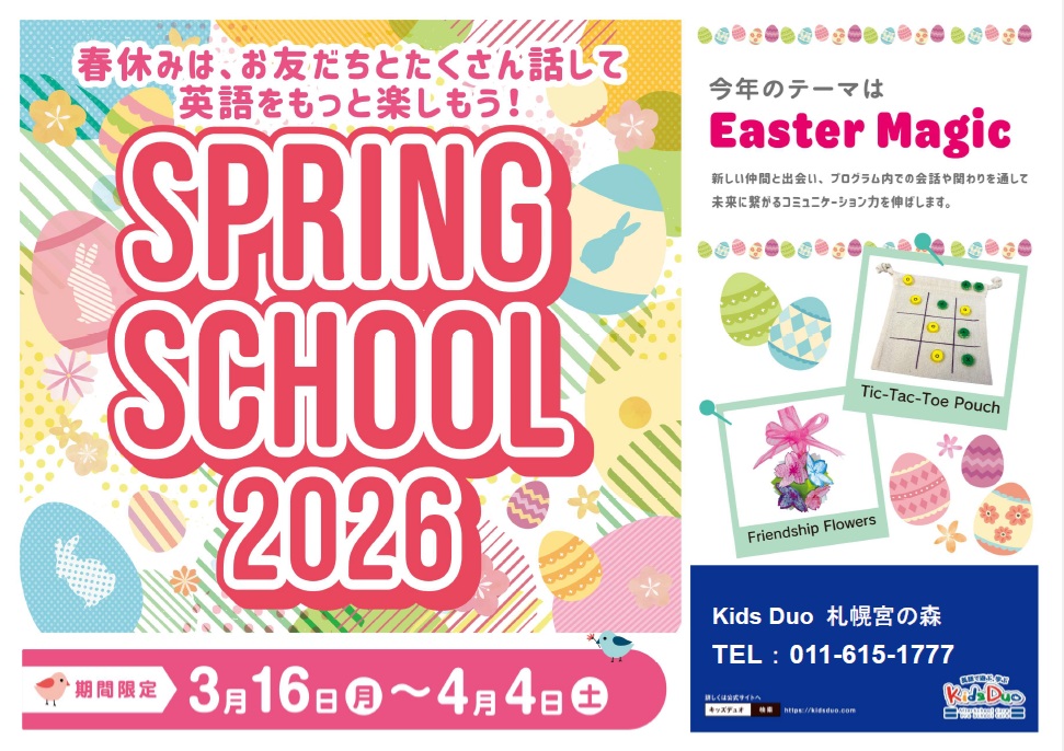 Kids Duo 札幌宮の森では、体験レッスンやスプリングスクール参加のお申し込みを受付中です。