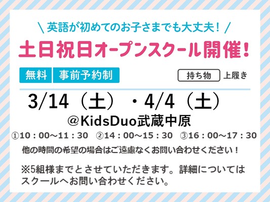 平日はどうしてもご来校が難しいお父様・お母様!是非この機会にKids Duoへお越しになって下さいね。人数限定で先着順となっております!