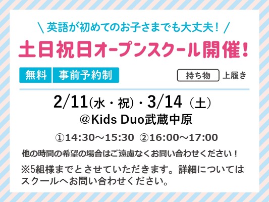 平日はどうしてもご来校が難しいお父様・お母様!是非この機会にKids Duoへお越しになって下さいね。人数限定で先着順となっております!