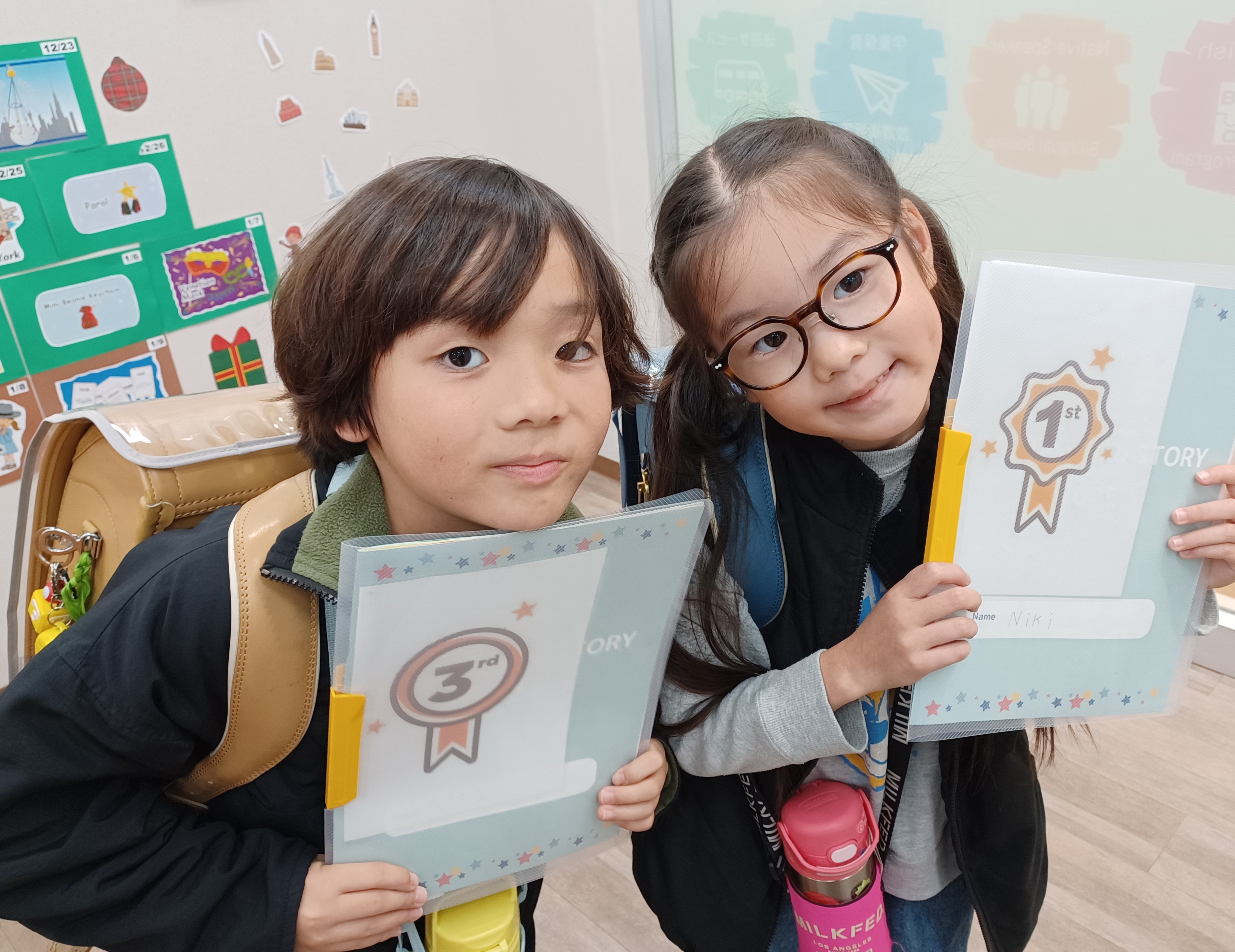 兄はもともと、他の英語教室に通っておりこちらに移ってきました。初めはオールイングリッシュで長時間の環境はどうかな?と思いましたが、ゲームがあったり、公園に行ったりと楽しい時間がたくさんあり、全く苦にならないどころか、サマースクールなど長期のお休みの時は、どんどん教室に通いたいと言うほどです。妹は年少の頃に始めたため、初めは私とお別れするときには涙が出ていましたが、優しいお兄さん、お姉さん、とても楽しい先生たちに囲まれて、通うのがどんどん楽しくなっているようです。最近では、お風呂で英語で数を数えたり、2人で英語ごっこみたいなことをして楽しそうにしています。去年からは2人で英検Jr.®にチャレンジしており、これからは英検®も受けていければと思っています。教室のサポートも手厚く、2人とも頑張ろうという気持ちにつながっているようです。今後ともどうぞよろしくお願いいたします。ありがとうございます。
