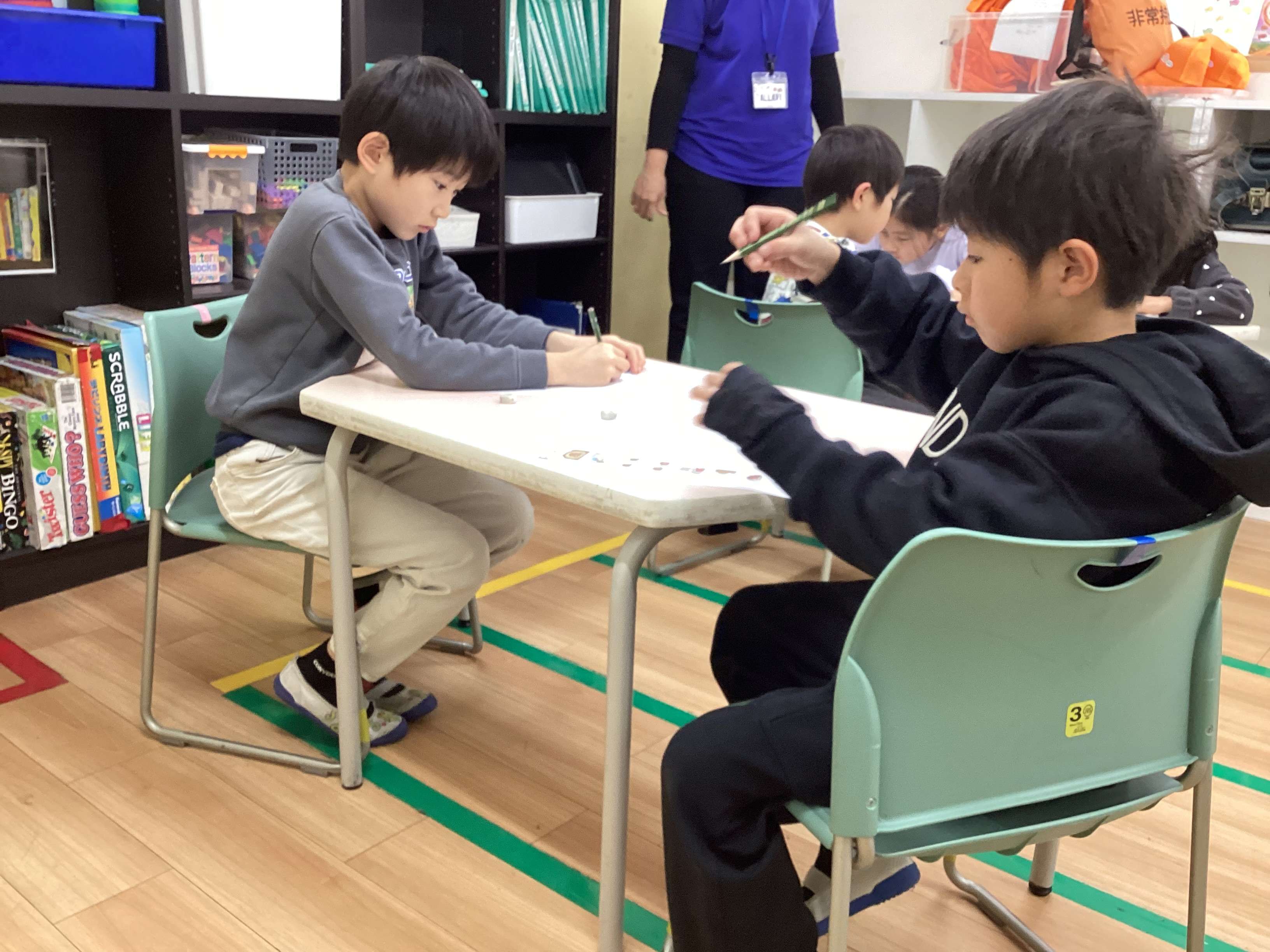この時間は塾や学校みたいにノートを使わないし大変じゃないんだ。皆で遊ぶと学ぶの2つが出来るよ。決まったフレーズ以外の英語も学びながらワークシートでスペルを覚えるのが楽しい!