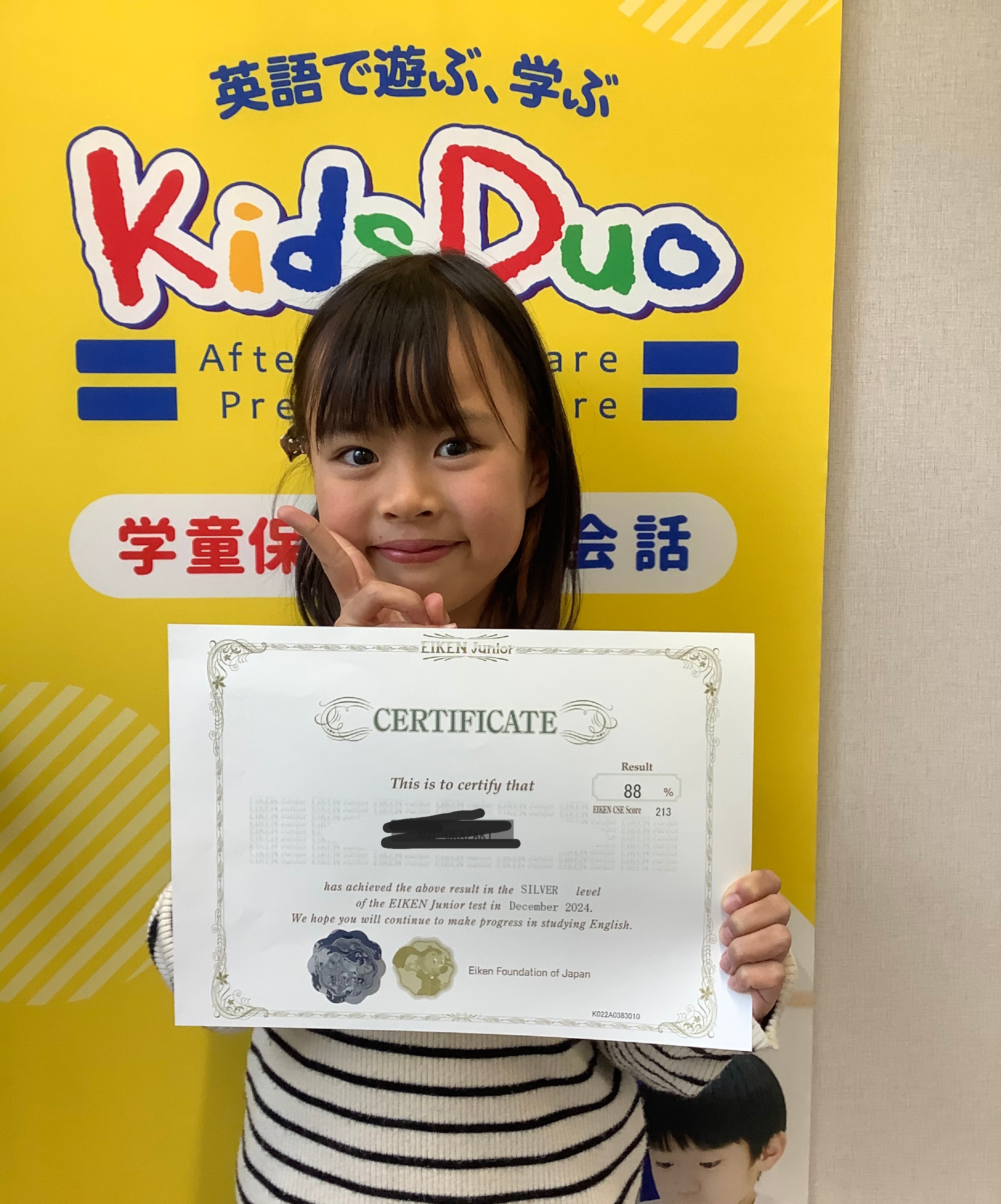 保護者様より:小学1年生の4月から通い始めています。慣れるまで時間がかかる子でしたが今では自発的に英語を練習する姿が見られます。これまでは失敗を恐れるタイプの子でしたが、Kids Duoのウェルカム感や気軽な挑戦を良しとするカルチャーがうちの子にはとても良いのだと思います。