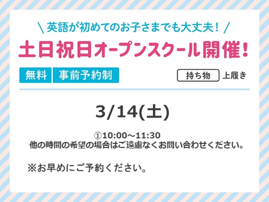 - 平日のご来校が難しい方は週末に是非遊びに来てください!オープンスクールを開催します!!!