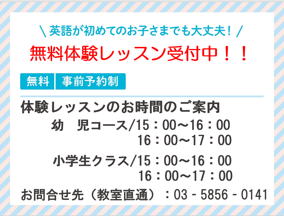 ※幼児コース・小学生コース、若干名空き枠あります。 - 普段のレッスンの様子を観たい方、無料レッスンした方は平日の体験レッスンがおススメです。