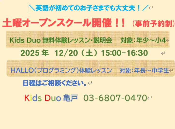 英語学童保育 Kids Duo 亀戸からのお知らせ