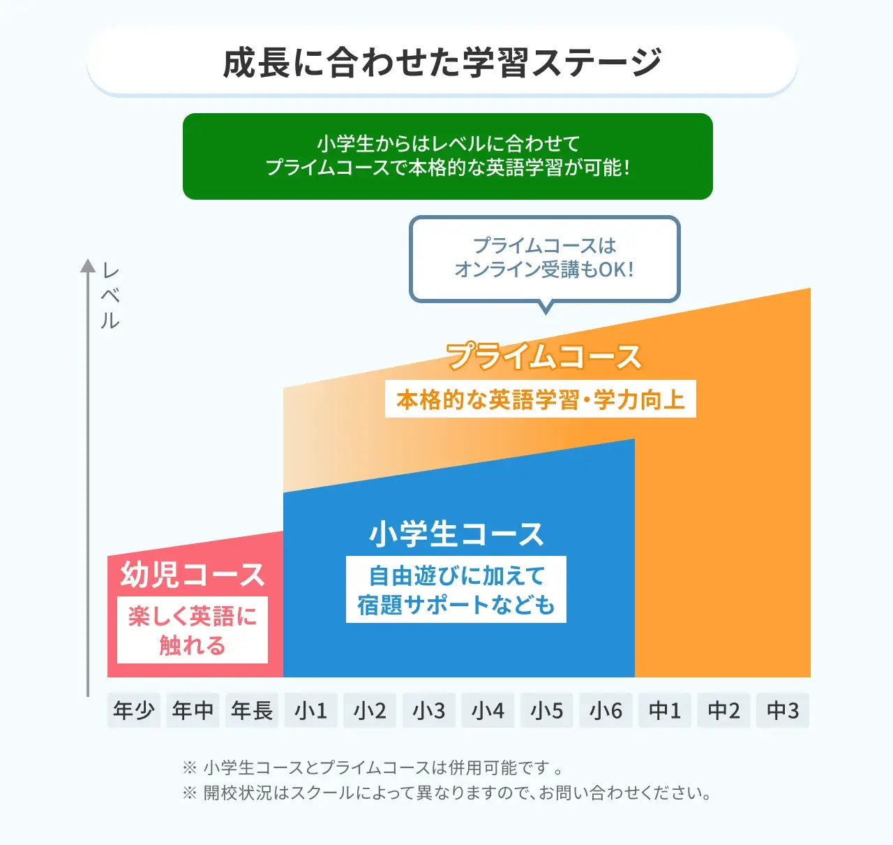 Kids Duoでは無学年の集団と長時間の英語環境で、お子さまの英語コミュニケーション力、自分力、共創力、想像力を育んでいきます。VUCAの時代を生きるお子さまたちにとって必要不可欠とされるこれらの力は、短期間で身に付けることはできません。学年に合わせて効果的に活用いただきながら、お子さま一人ひとりに合わせた成長をサポートしてまいります。学年ごとの過ごし方についてご紹介していきます。